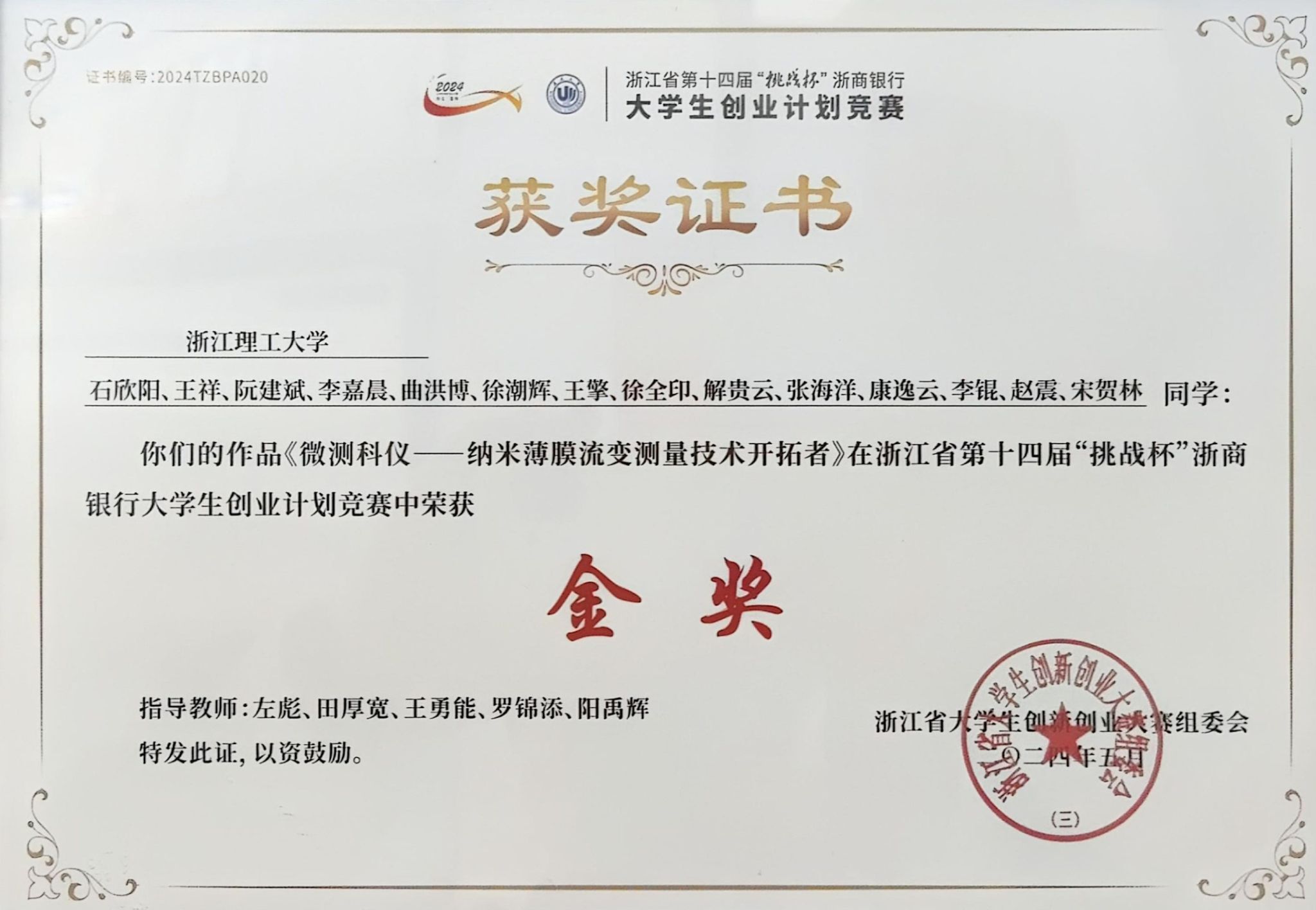 浙江省第十四届“挑战杯”浙商银行大学生创业计划竞赛金奖