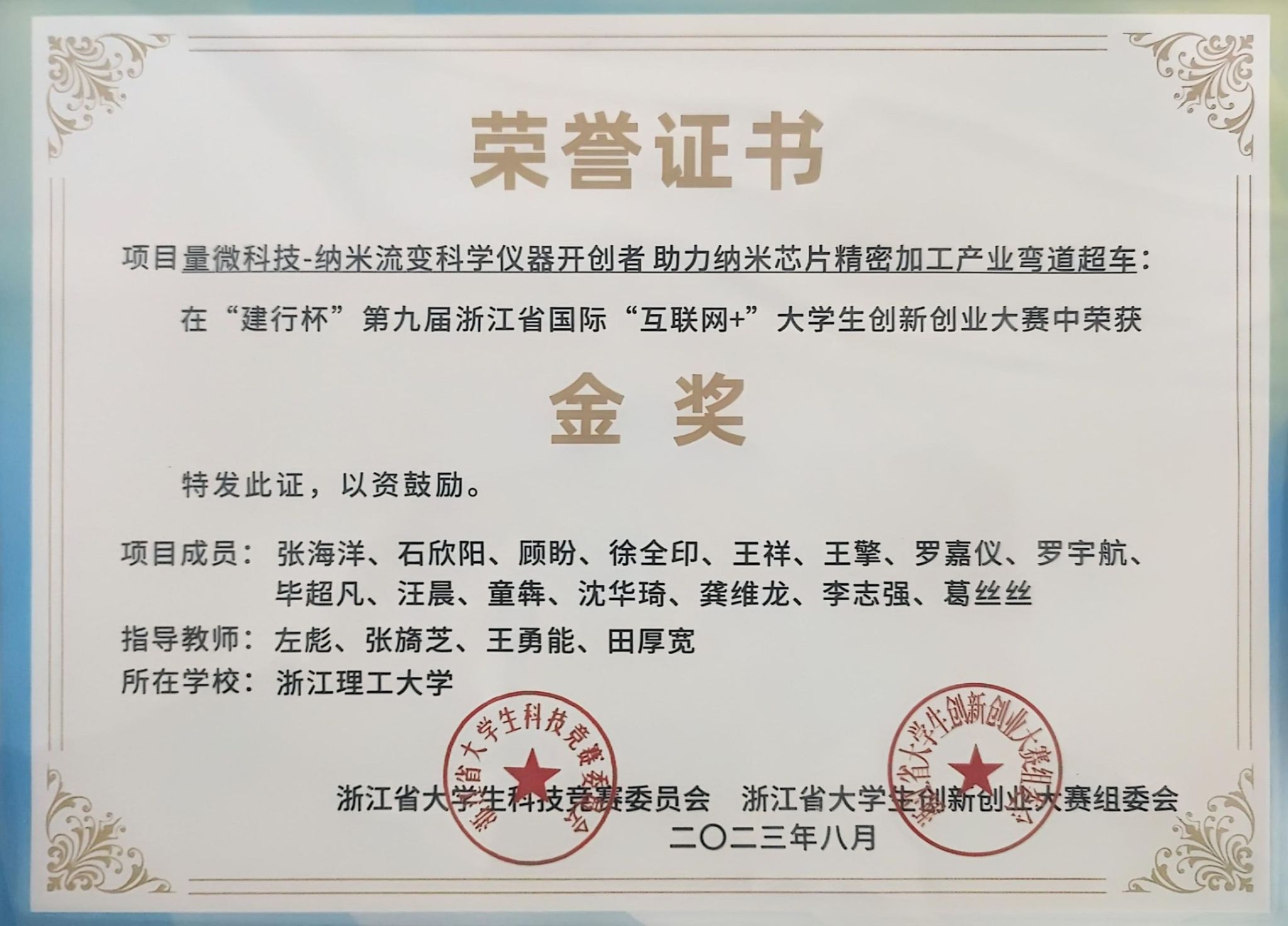 “建行杯”第九届浙江省国际“互联网+”大学生创新创业大赛金奖