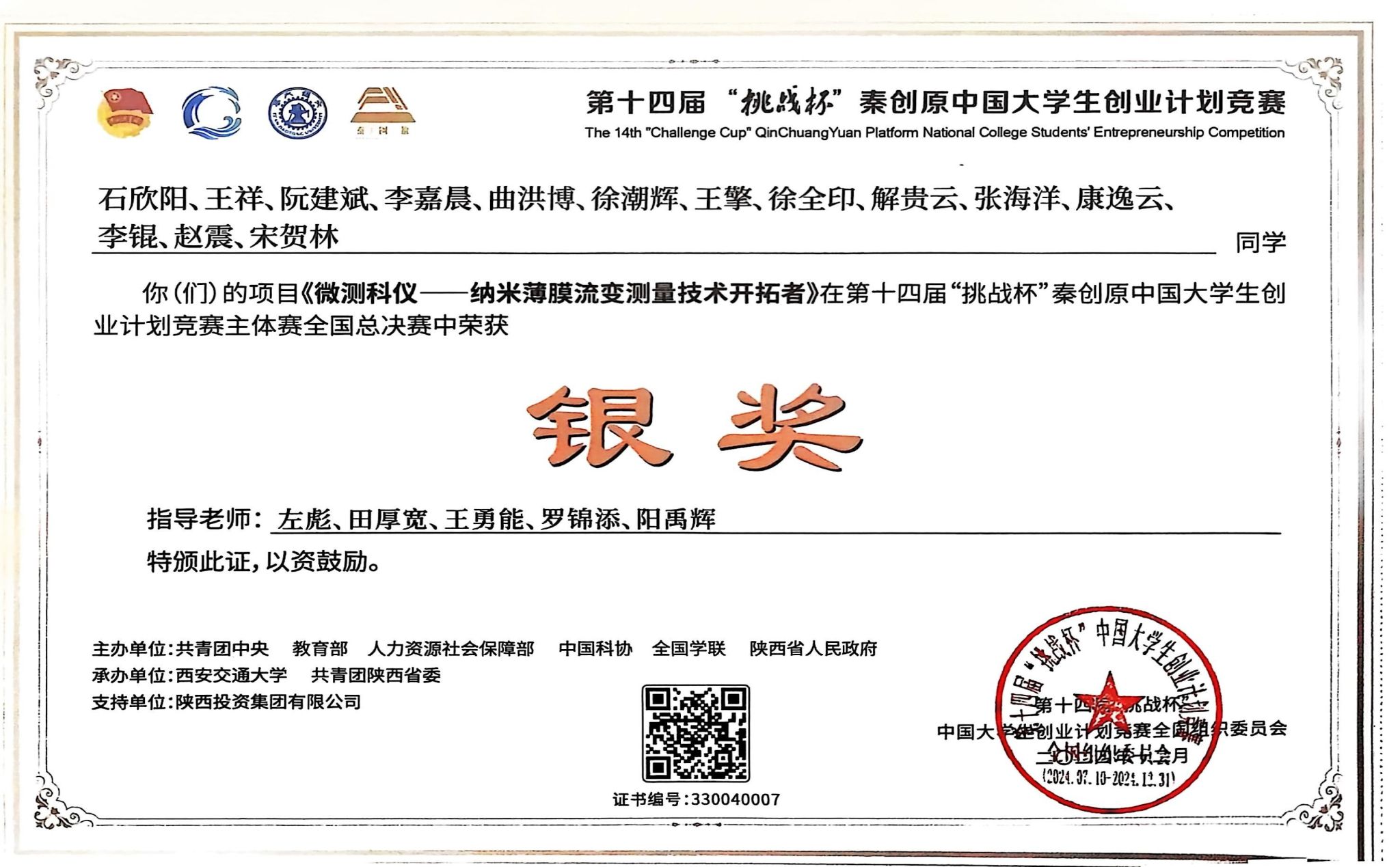 第十四届“挑战杯”秦创原中国大学生创业计划竞赛主体赛全国总决赛银奖
