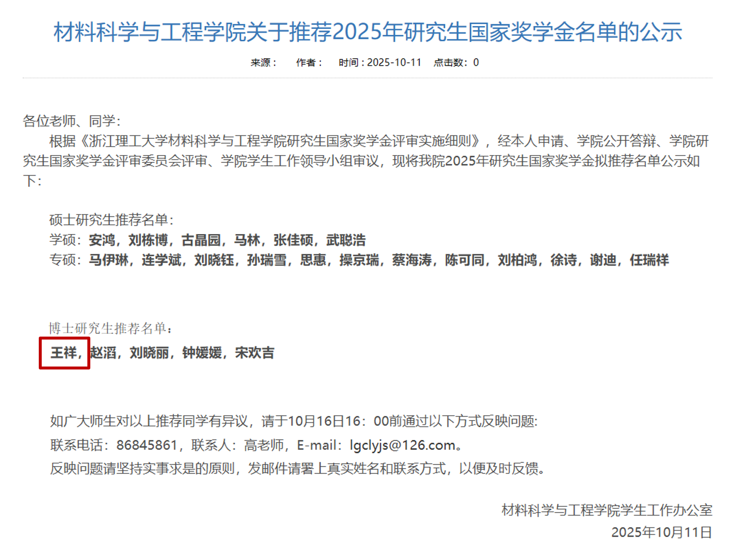 祝贺课题组博士生王祥荣获浙江理工大学2025年研究生国家奖学金!