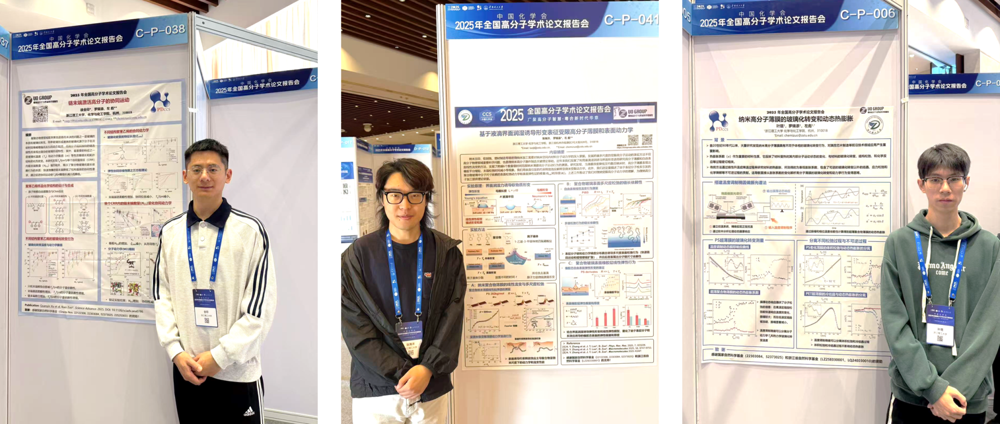 博士后徐全印、博士生张海洋、硕士生叶琨三名同学在墙报环节分别以“链末端激活的高分子的协同运动”、“基于液滴界面润湿诱导形变表征受限高分子薄膜和表面动力学”、“纳米高分子薄膜的玻璃化转变和动态热膨胀”为主题展示了各自的研究工作并荣获本次会议的优秀墙报奖。