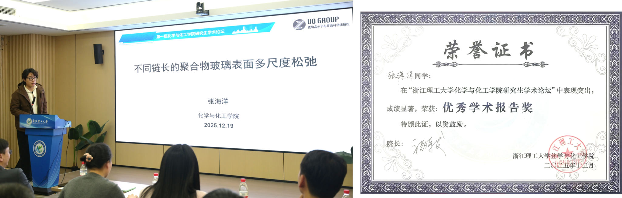 在本次学术论坛中,课题组博士生张海洋以“不同链长的聚合物玻璃表面多尺度松弛”为题进行口头报告交流。报告内容展现了其近年来的工作成果,与会师生讨论热烈。最终,张海洋同学通过精彩的汇报获得到场师生的一致好评,以及本次论坛的“优秀学术报告奖”。