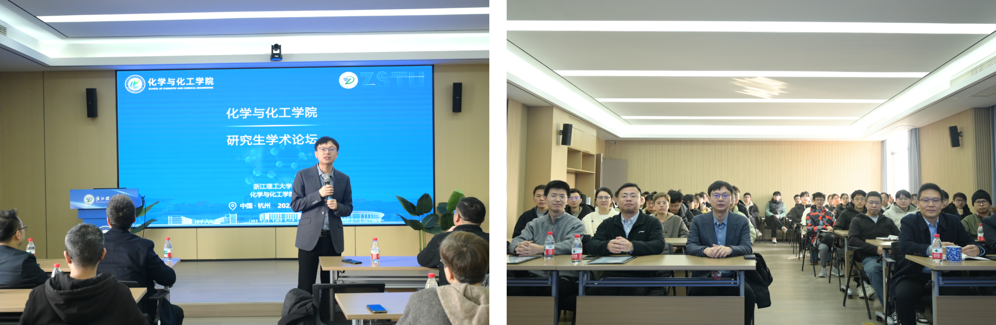 2025年12月19日,课题组成员参加由浙江理工大学化学与化工学院主办的研究生学术论坛。本次论坛由左彪教授主持,邀请到不同领域专家进行学术交流,活动现场座无虚席,学院内老师及同学们积极参与提问交流。