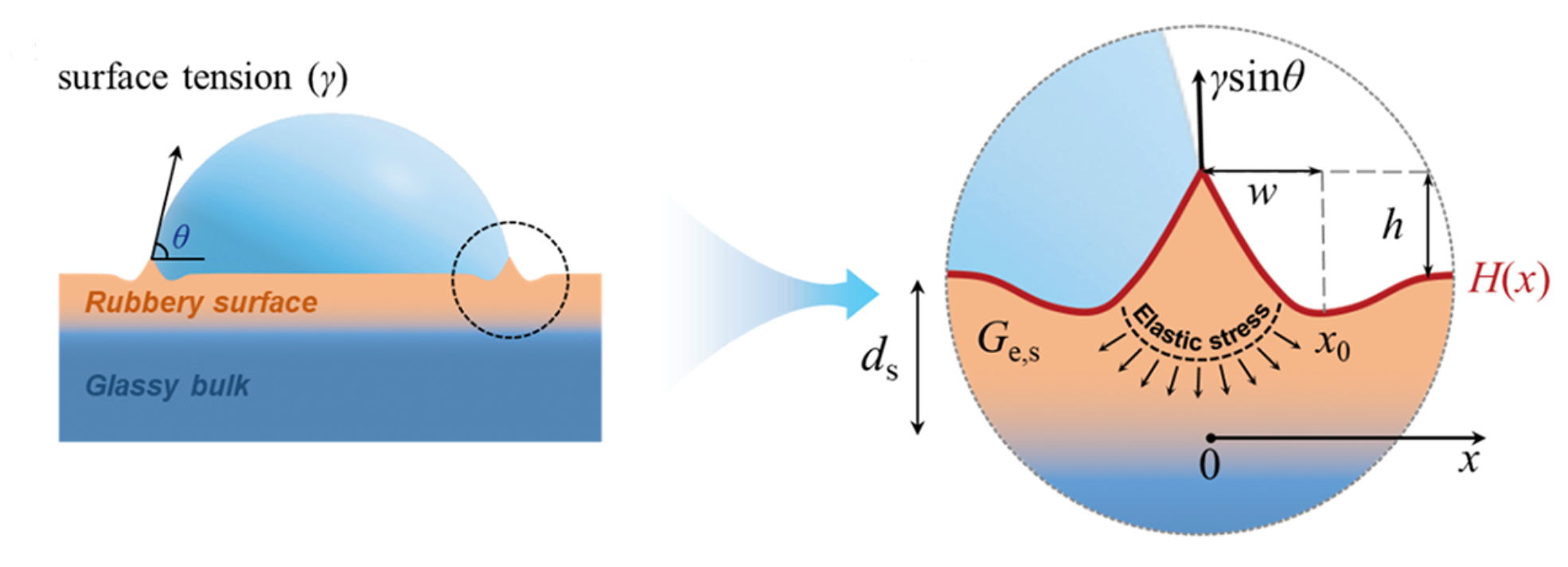 图 1. 液滴界面润湿力诱导高分子玻璃体橡胶表面层发生弹性形变示意图。