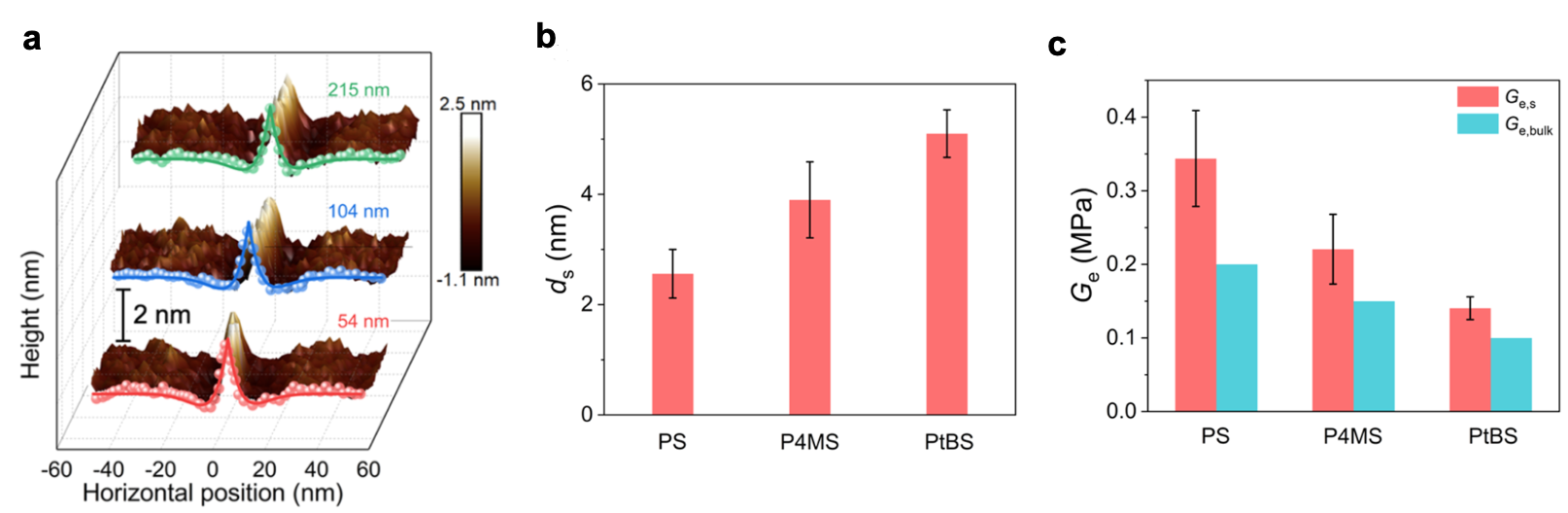 如图2,利用 AFM测量表面润湿脊的形貌从而获得了其高度和宽度;将高度和宽度代入公式 2,即可获得高分子玻璃体橡胶表面层弹性模量和厚度。他们发现,在 T = Tg - 10K 下,聚苯乙烯类高分子玻璃表面层厚度为 2 ~ 5 nm,且橡胶表面层厚度随着侧基尺寸增大而增厚;聚叔丁基苯乙烯(PTBS)> 聚4-甲基苯乙烯(P4MS)> 聚苯乙烯(PS)。此外,由于界面伪缠结的作用,橡胶表面层的弹性模量高于由常规拓扑缠结所定义的橡胶平台模量的数值(图 2)。这一方法首次实现了对玻璃态高分子表面弹性模量的测定,并且发现了由于界面伪缠结引起的橡胶表面层模量增大、硬度提高的现象;为我们理解高分子表面力学提供新的视角。